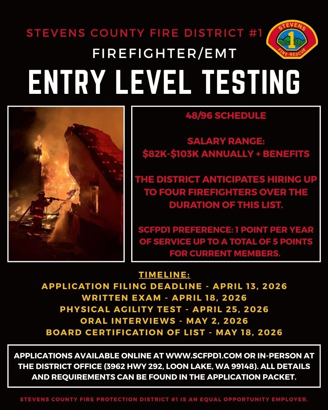 Career Opportunities Mar 4 Written By Dee-Andra Schmidt Stevens County Fire Protection District #1 is now accepting applications for entry level FF/EMT Application Packet Dee-Andra Schmidt